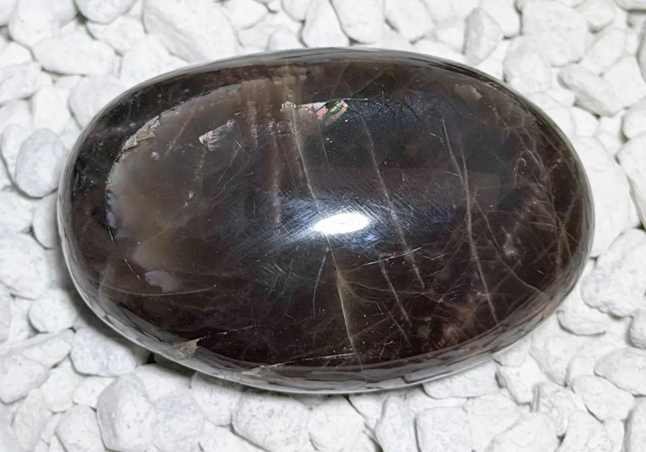 Ein edler Seifenstein aus schwarzem Mondstein in A-Qualität, handverlesen und einzigartig in Farbe und Struktur. Jeder Stein ist ein einzigartiges Naturstück aus Madagaskar.