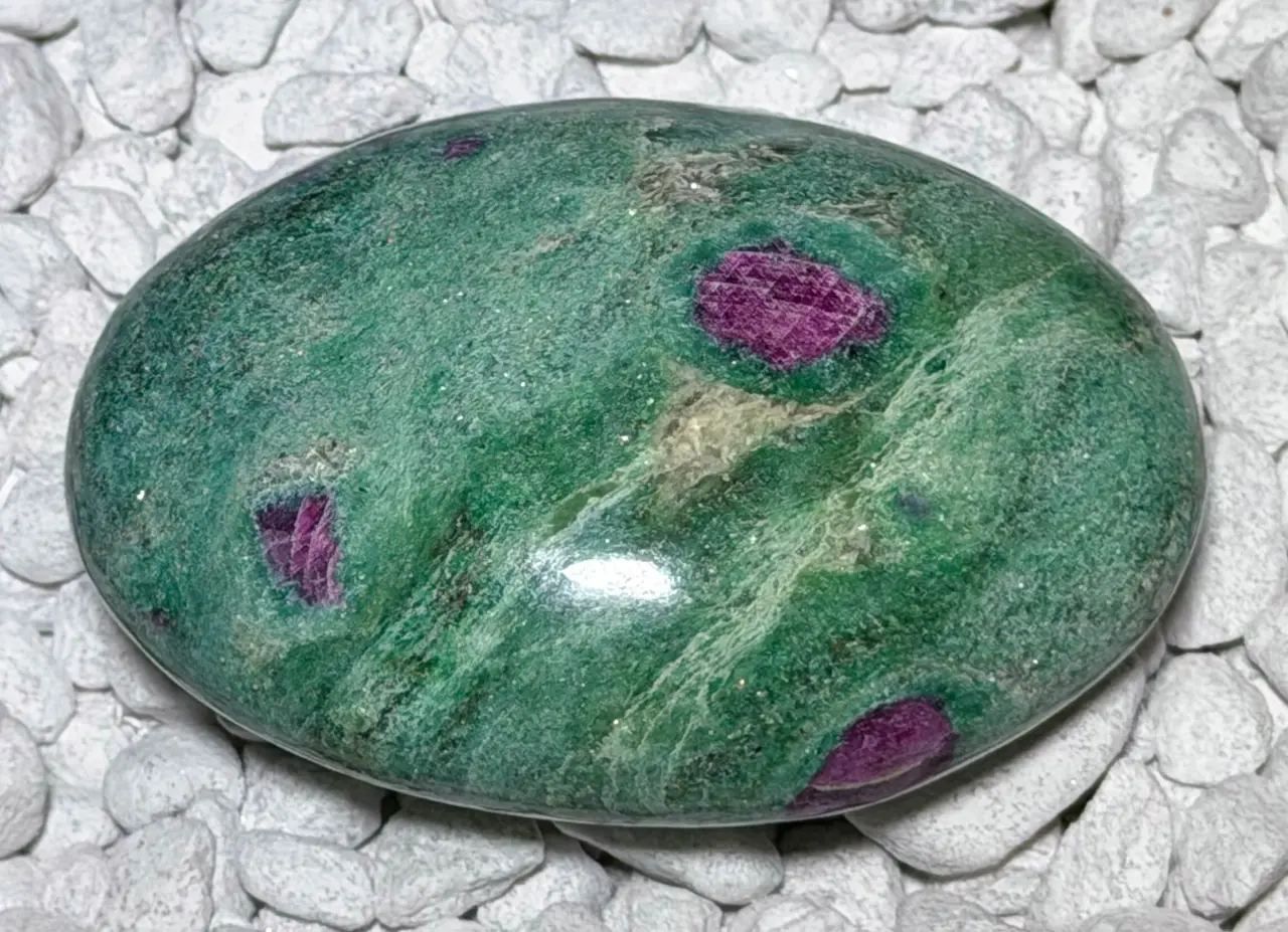 Ein außergewöhnlich schöner Rubin-Fuchsit Seifenstein in XL-Größe, handverlesen und gefertigt aus echtem Naturstein in absoluter A-Qualität. Dieser Edelstein vereint die kraftvolle Energie des Rubins mit der sanften, harmonisierenden Wirkung des Fuchsits. Die charakteristischen grünen, rosafarbenen und violett-roten Farbstrukturen machen jedes Stück zu einem faszinierenden Natur-Unikat.
