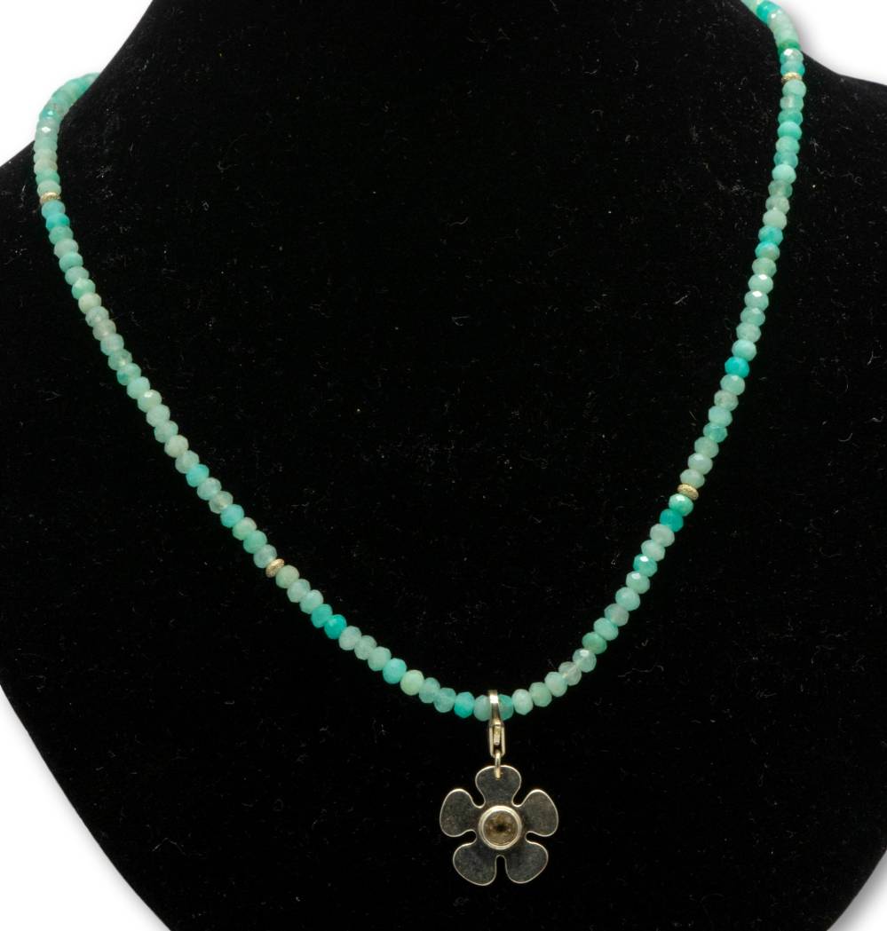 zauberhaftes Edelstein Collier aus Amazonit - handgefertigt Blumen Charm mit Topas alle Zwischenteile aus 925er Sterling Silber absolutes Unikat - Auserlesene Edelsteine Der Schmuck ist somit absolut hautverträglich und angenehm zu tragen 925er Silber Magnetverschluss - Länge: ca. 47cm