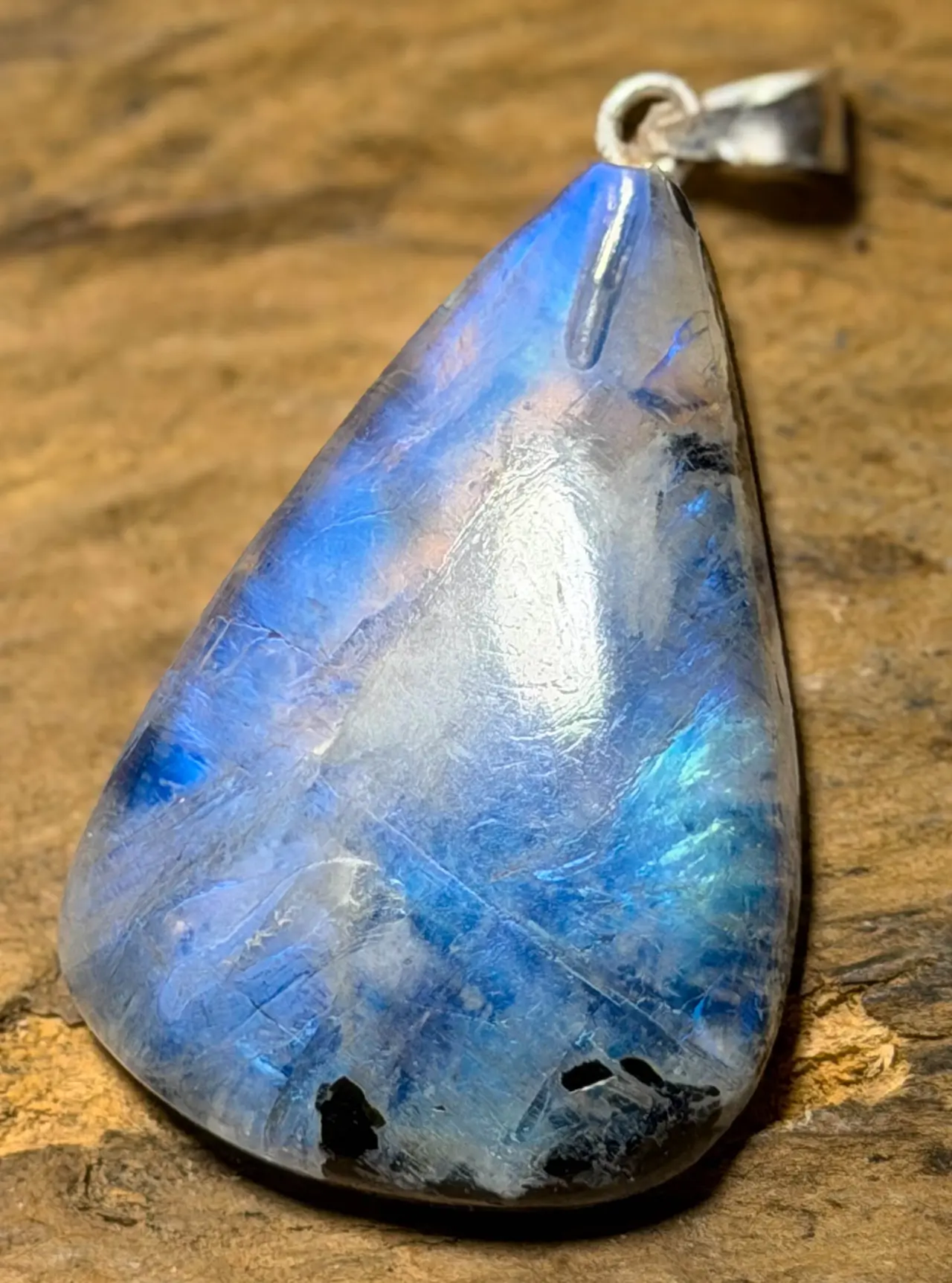 Regenbogenmondstein Anhänger – mit 925er Silberöse (40 x 23 mm)