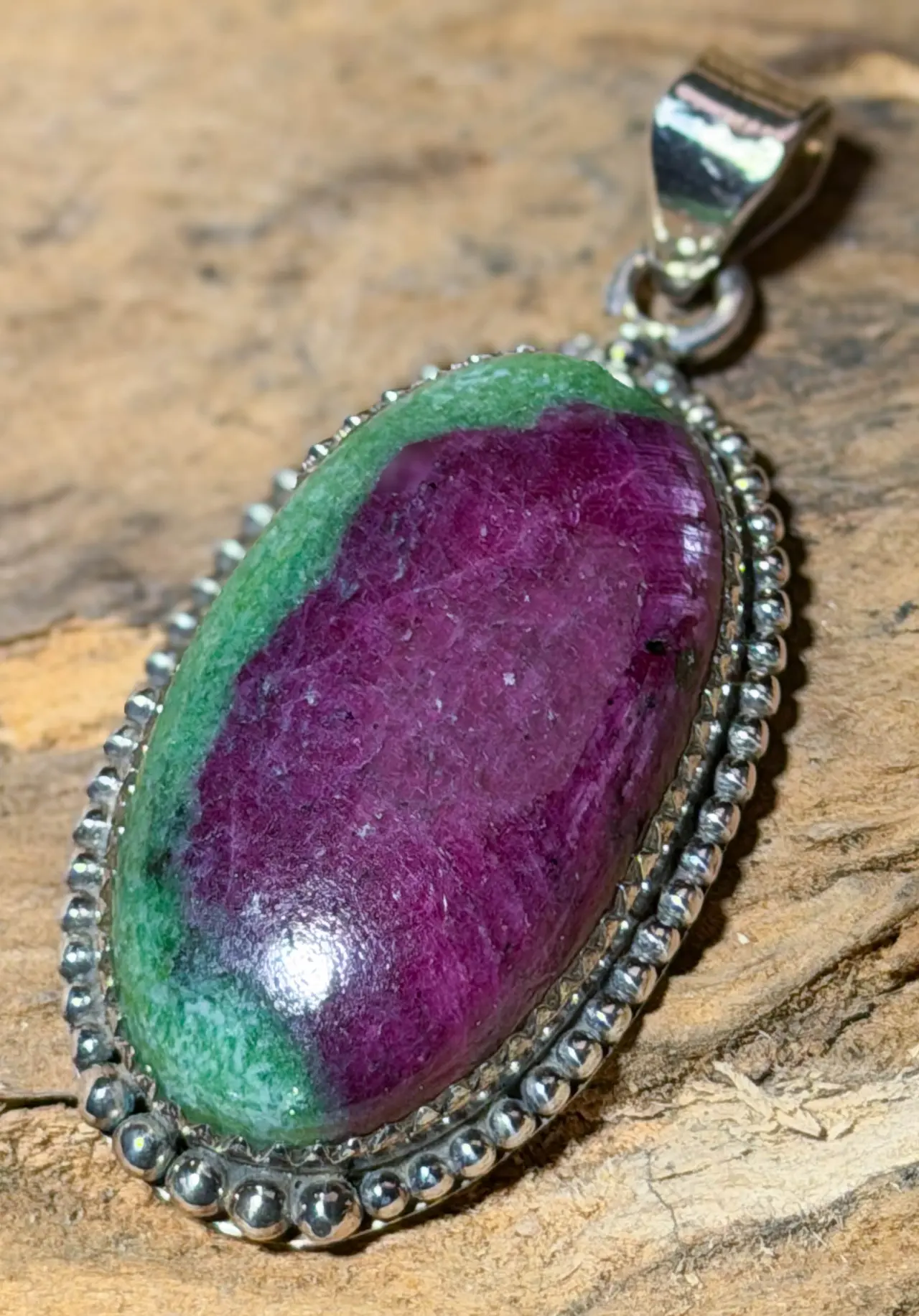 Dieser edle Edelstein-Anhänger aus Rubin-Zoisit fasziniert durch seine natürliche Farbvielfalt und energetische Ausstrahlung. Das Zusammenspiel aus kräftigem Grün und leuchtendem Rubinrot symbolisiert die Vereinigung von Herzenergie und Lebensfreude – ein Ausdruck von Kraft, Liebe und innerer Balance.
