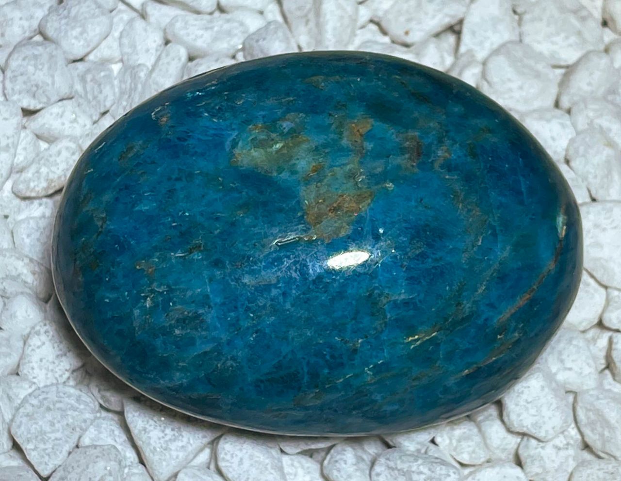 Ein edler Apatit Seifenstein in A-Qualität, fein geschliffen und poliert. Der Edelstein besticht durch seine intensive blau-türkise Farbgebung mit natürlichen Strukturen und leichten Transparenzen. Jeder Stein ist ein einzigartiges Natur-Unikat mit lebendiger Farbwirkung und glatter Oberfläche.
