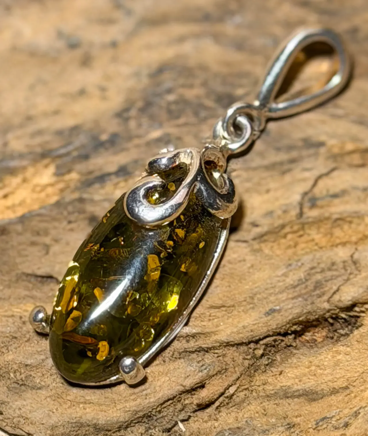 Edler Anhänger mit grünem Bernstein – 925er Silber (33 × 10 mm)