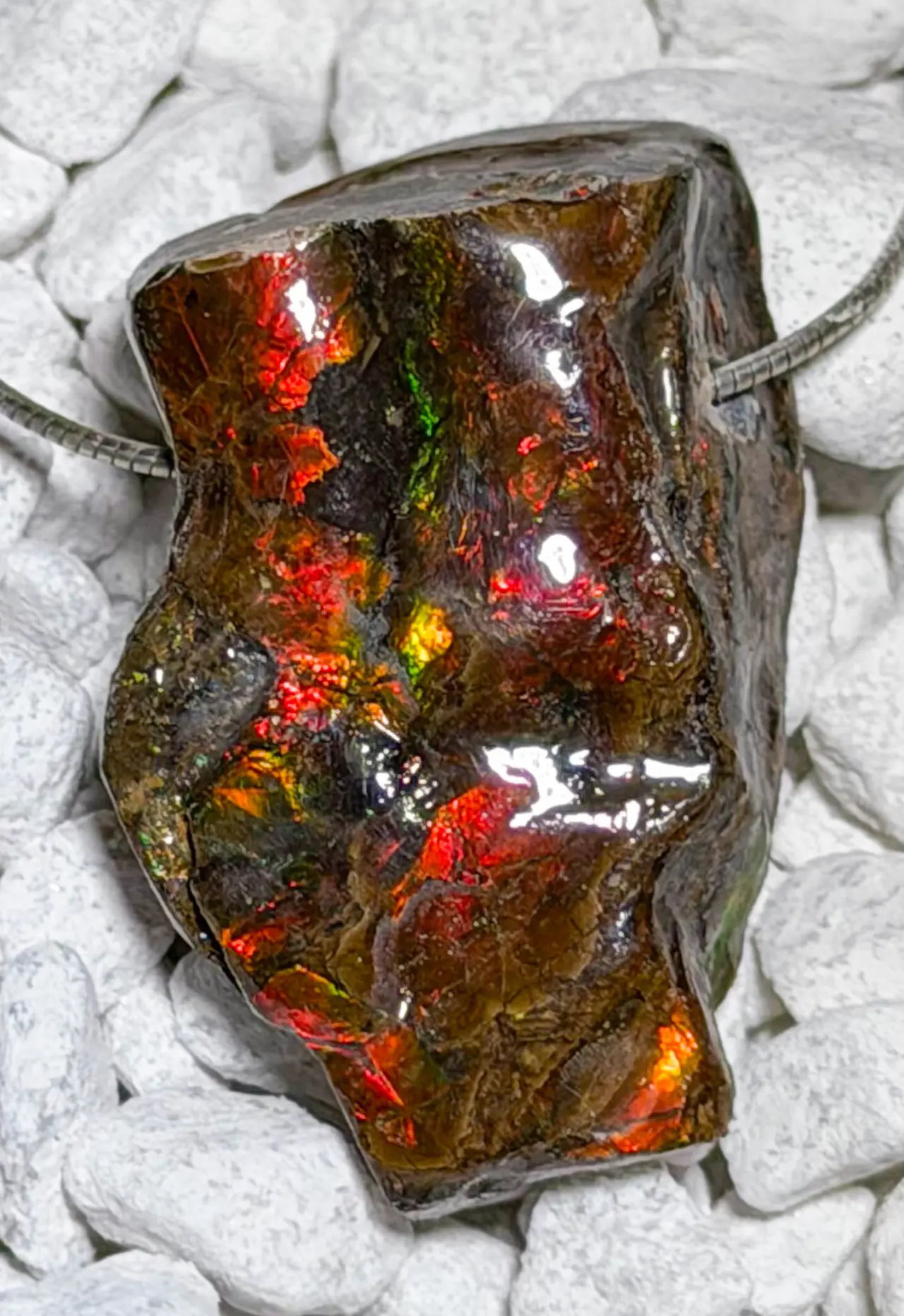 Ein außergewöhnlicher Edelsteinanhänger aus Ammolit, der durch seine faszinierenden Farbspiele besticht. Jeder Stein ist ein einzigartiges Naturstück und macht diesen Anhänger zu einem besonderen Schmuckstück.