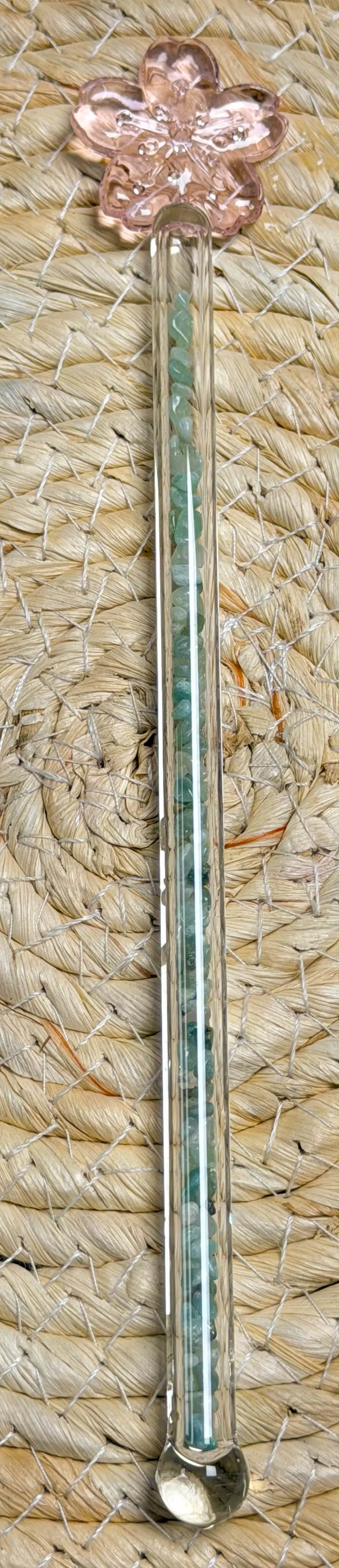 Der Premium Vital Crystal Water Stick – Aventurin Blume ist eine elegante und natürliche Möglichkeit, Ihr Trinkwasser mit der harmonisierenden Kraft des Aventurins zu energetisieren. Jeder Glasstab ist mit natürlichen, polierten Aventurin-Steinen gefüllt und trägt das eingravierte Blumen-Symbol, das für Wachstum, Harmonie und die Entfaltung des Lebens steht.