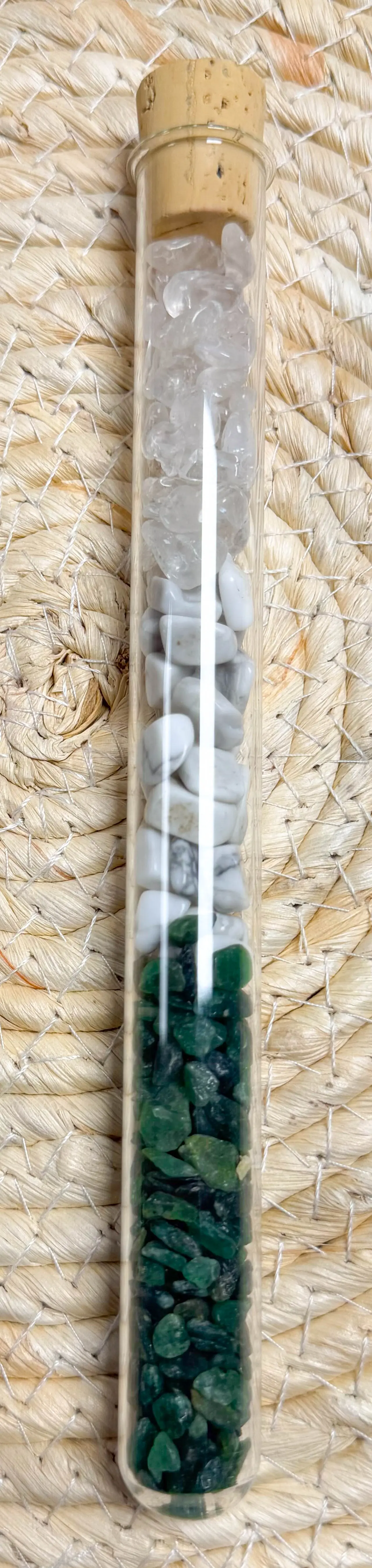 Sie können rohe, unpolierte oder geschliffene Edelsteine nutzen. Wir empfehlen kleine Steine und ein Reagenzglas.