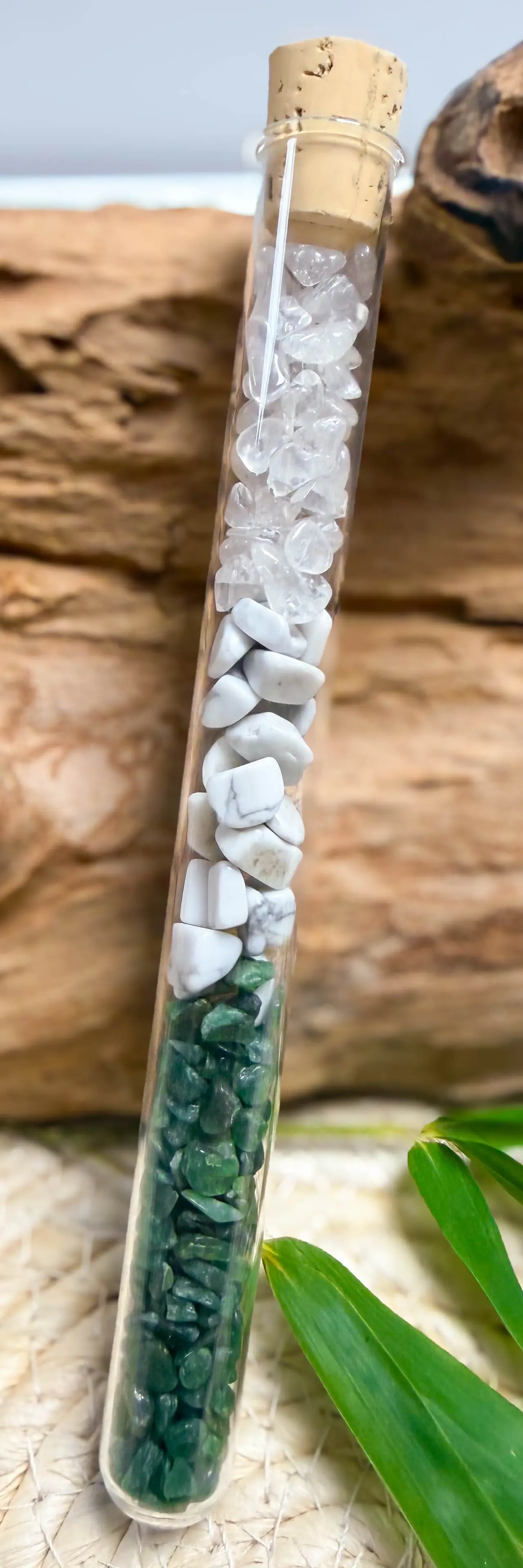 Diese fein abgestimmte Mischung aus Aventurin, Magnesit (Howlith) und Bergkristall vereint Ruhe, Gelassenheit und Klarheit zu einer harmonischen Energiekomposition: