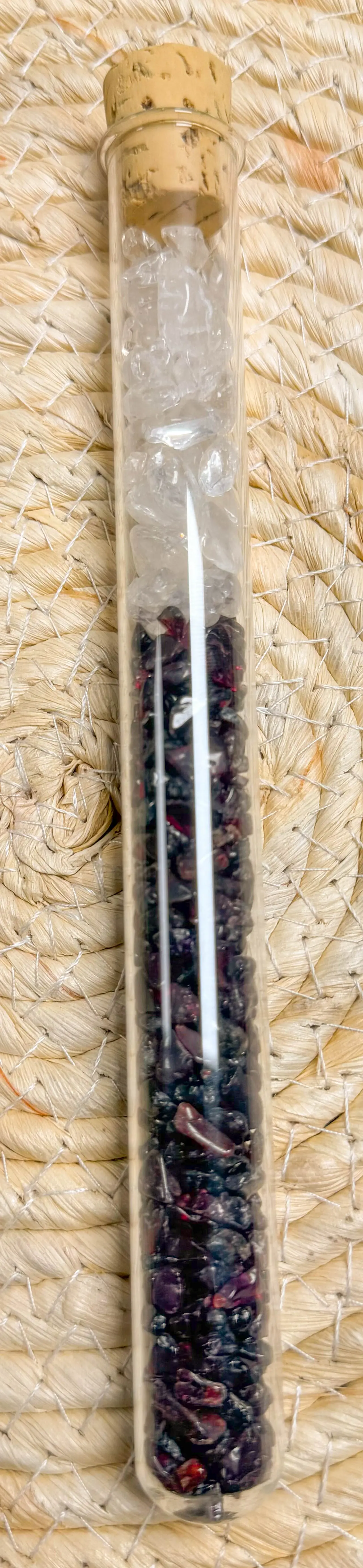 Sie können rohe, unpolierte oder geschliffene Edelsteine nutzen. Wir empfehlen kleine Steine und ein Reagenzglas.
