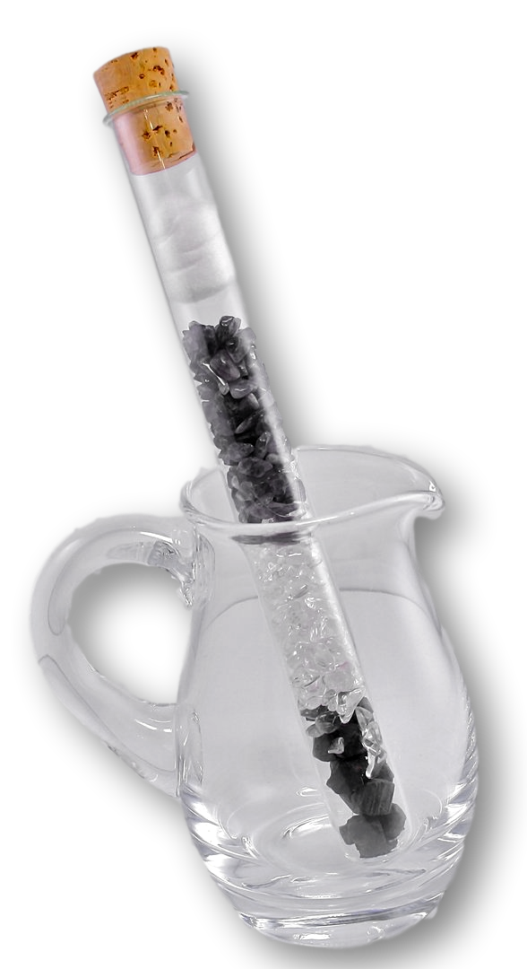 Wasseraufbereitung mit der Reagenzglasmethode: Die Edelsteine liegen im Reagenzglas, das im Glaskrug/Glas steht. Nach ca. 12 Stunden kann das Wasser getrunken werden.