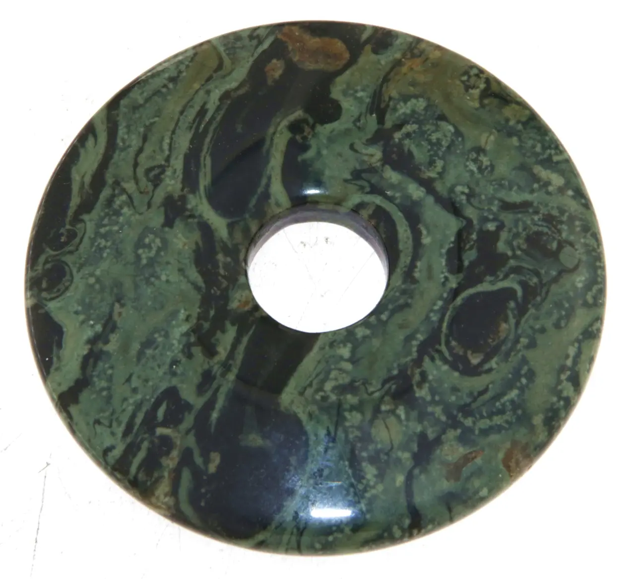 Der Schlangenjaspis ist ein faszinierender Edelstein mit einzigartiger Maserung. Dieser hochwertige Donut-Anhänger (PI-Scheibe) wird inklusive passendem Stoffband geliefert und ist sofort tragbar.