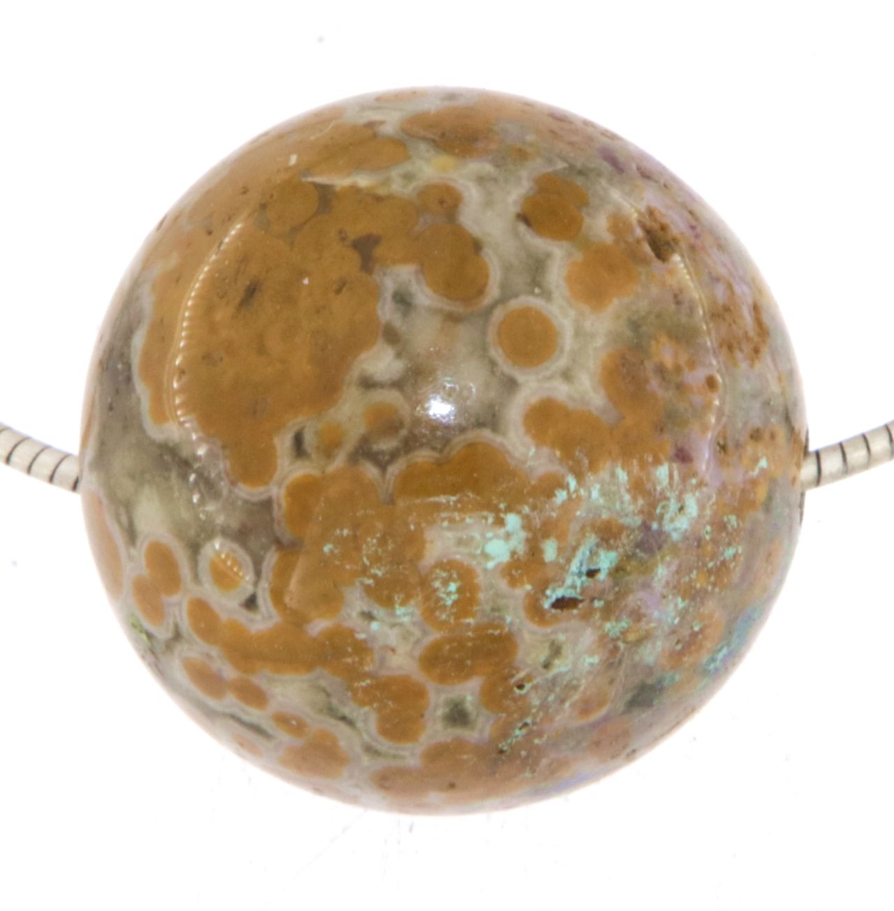 Edelstein Kugel Anhänger aus Ozeanjaspis mit einem passenden Stoffband.