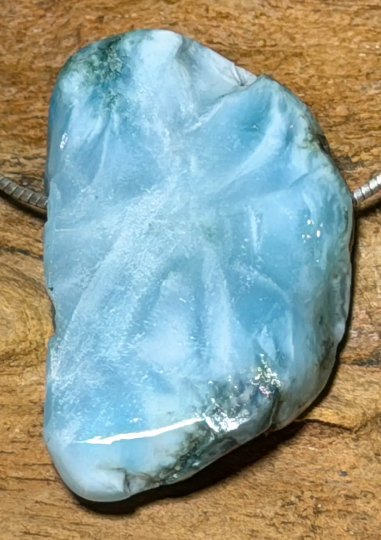 Ein wunderschöner Edelsteinanhänger aus echtem Larimar, auch bekannt als Atlantisstein, in teils polierter Rohsteinform. Der Larimar verzaubert mit seinem sanften Farbspiel aus Himmelblau und Weiß, das an Meer und Himmel erinnert – Sinnbilder für Freiheit, Harmonie und innere Ruhe.