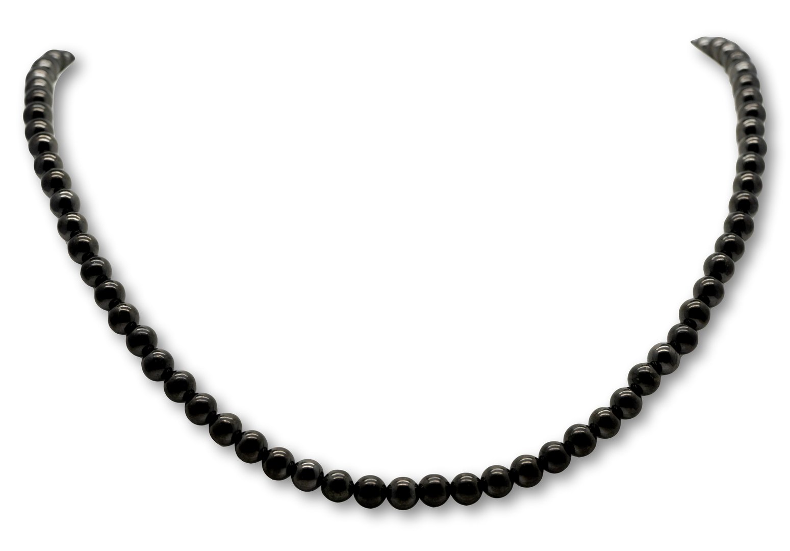 Ein edles, handgefertigtes Edelstein-Collier aus hochwertigem Schungit, kombiniert mit glänzenden Elementen aus 925er Sterling Silber. Die gleichmäßig geschliffenen Schungit-Perlen mit einem Durchmesser von ca. 6 mm verleihen dem Collier eine elegante, harmonische Optik.