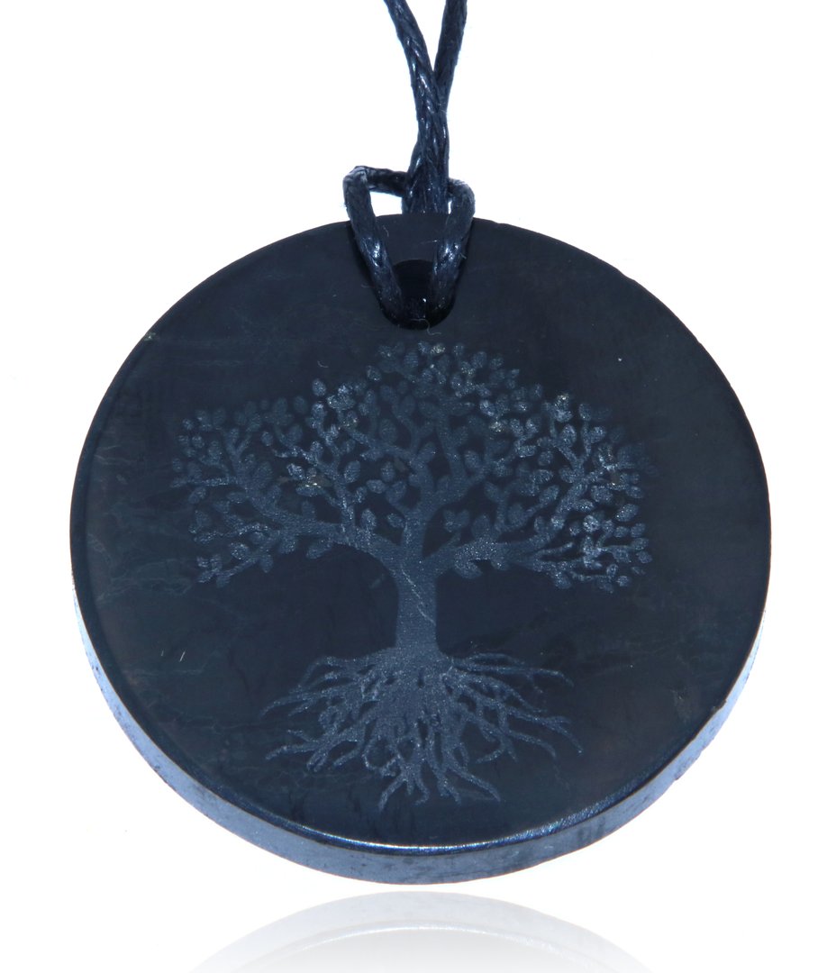 Edler Schungit Anhänger – Lebensbaum graviert, mit Stoffband (35 mm)