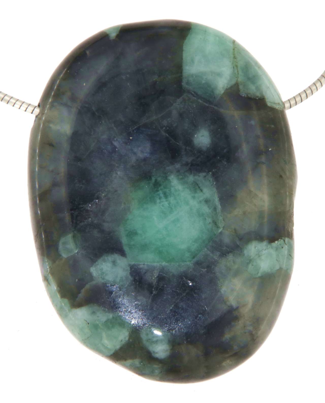 Edelstein Trommelstein Anhänger aus Smaragd mit einem passenden Stoffband.