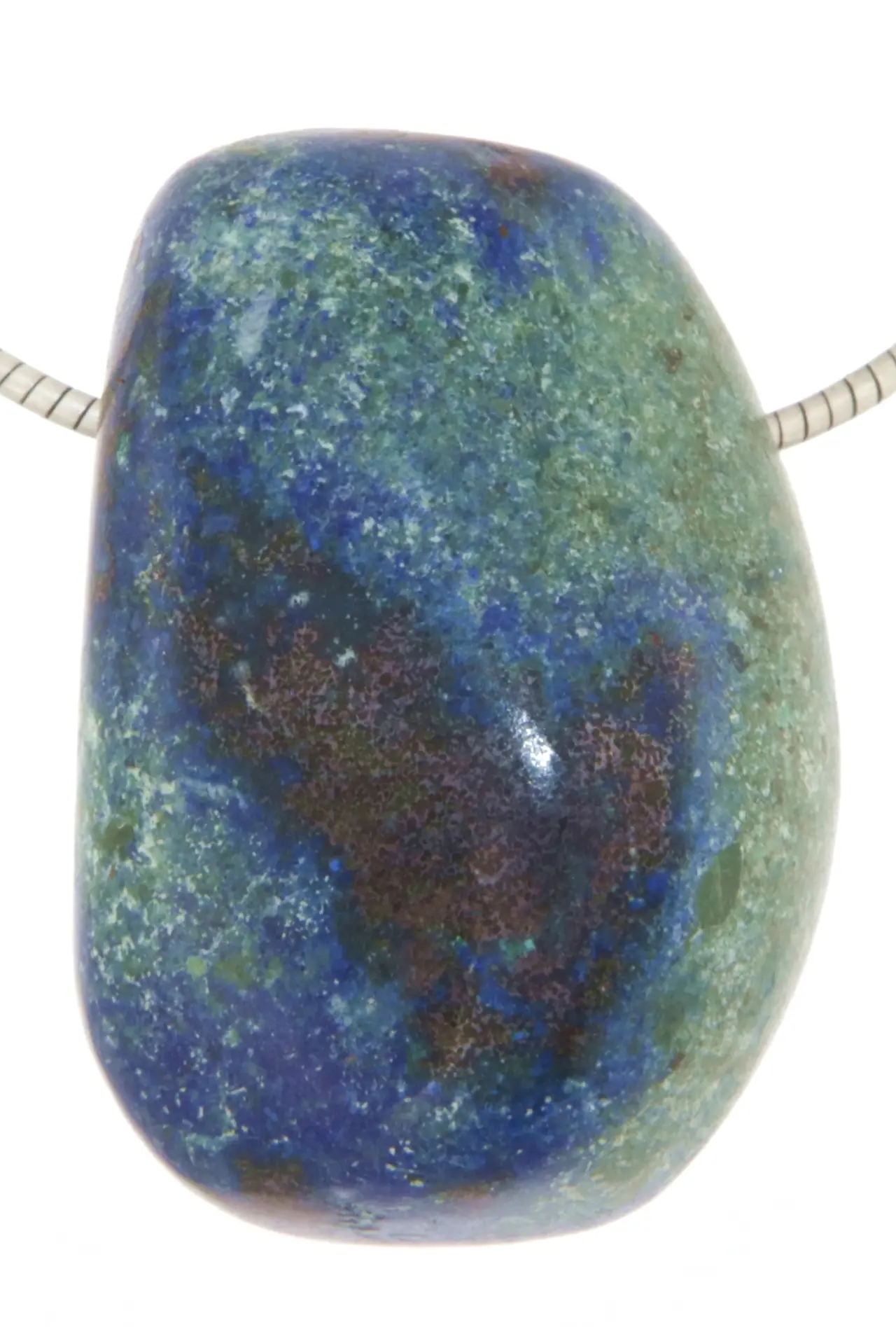 Ein edler Edelstein-Schmuckanhänger aus echtem Azurit, gefertigt aus einem polierten Trommelstein mit intensiver, tiefblauer Farbgebung. Der Azurit beeindruckt durch sein natürliches Farbspiel von dunklem bis leuchtendem Blau, oft durchzogen von zarten Strukturen, die ihm Tiefe und Charakter verleihen. Jeder Anhänger ist ein Unikat der Natur, individuell in Farbe und Form.