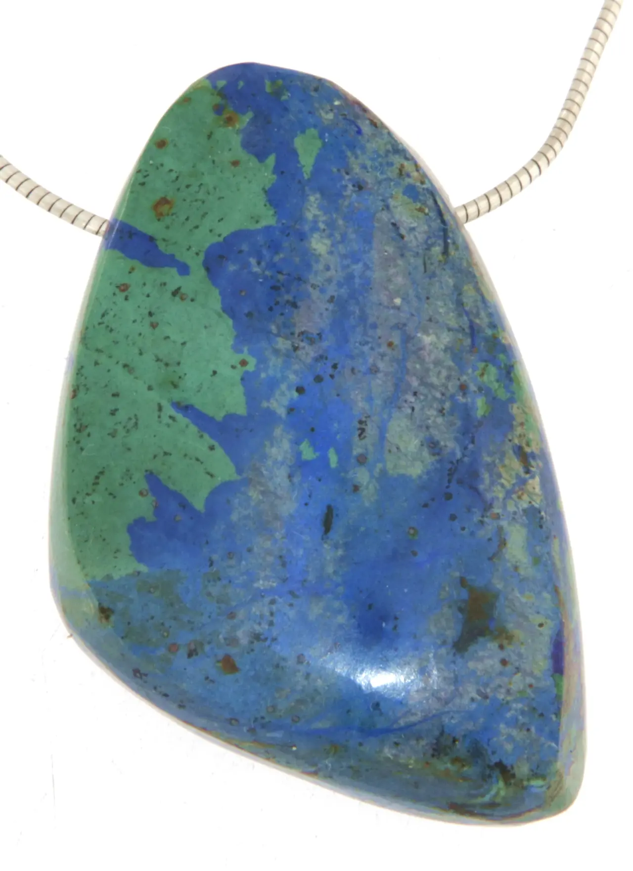 Erleben Sie die faszinierende Verbindung von Azurit und Malachit – zwei Edelsteinen, die in ihrer natürlichen Kombination ein atemberaubendes Farbspiel aus tiefem Blau und leuchtendem Grün zeigen. Dieser handgefertigte Trommelstein-Anhänger vereint die Schönheit beider Mineralien in einem harmonischen, ausdrucksstarken Schmuckstück.