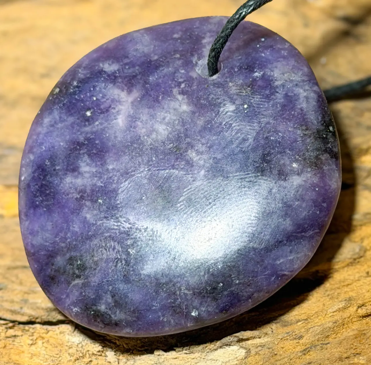 Edelstein-Trommelstein-Schmuckanhänger aus Lepidolith – mit Stoffband