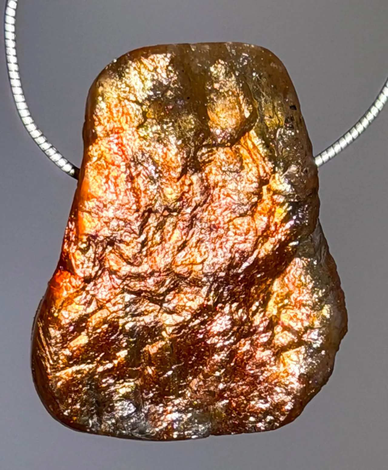 Ein edler Edelstein-Schmuckanhänger aus echtem Sonnenstein, gefertigt aus einem polierten Trommelstein mit warmem Glanz und natürlicher Struktur. Der Sonnenstein zeigt seine charakteristische orange bis goldschimmernde Farbgebung, die durch feine, glitzernde Einschlüsse entsteht und jedem Stein eine einzigartige Leuchtkraft verleiht. Jeder Anhänger ist ein Unikat der Natur, handverlesen und sorgfältig poliert.