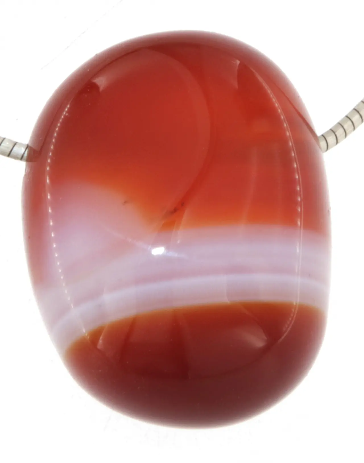 Ein edler Edelsteinanhänger aus Karneol, gefertigt aus einem fein polierten Trommelstein, der durch sein warmes, rötlich-oranges Farbspiel besticht. Der Karneol ist ein klassischer Schmuckstein, der für Lebensfreude, Vitalität und natürliche Schönheit steht.