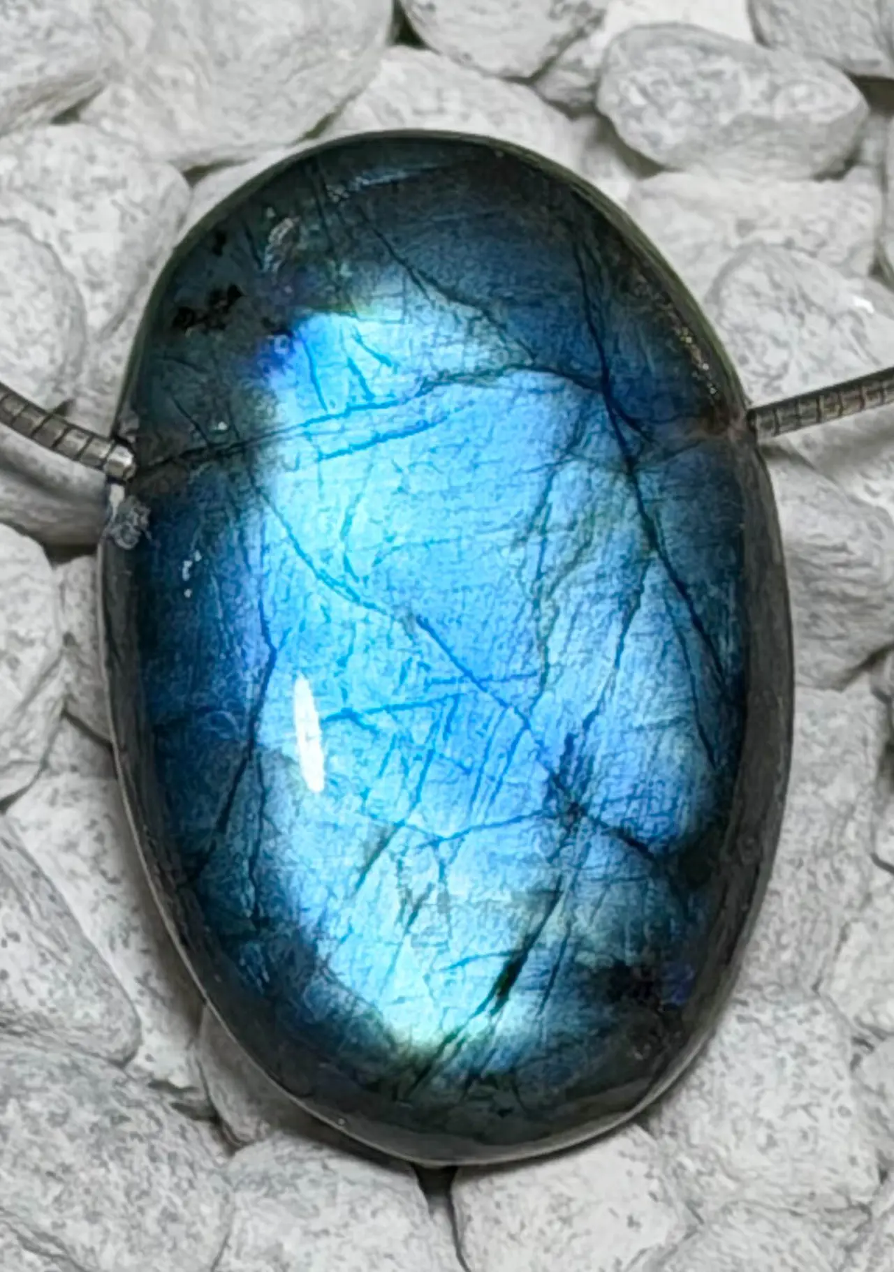 Ein faszinierender Labradorit-Anhänger, der durch sein geheimnisvolles Farbspiel in Blau-, Grün- und Goldtönen begeistert.