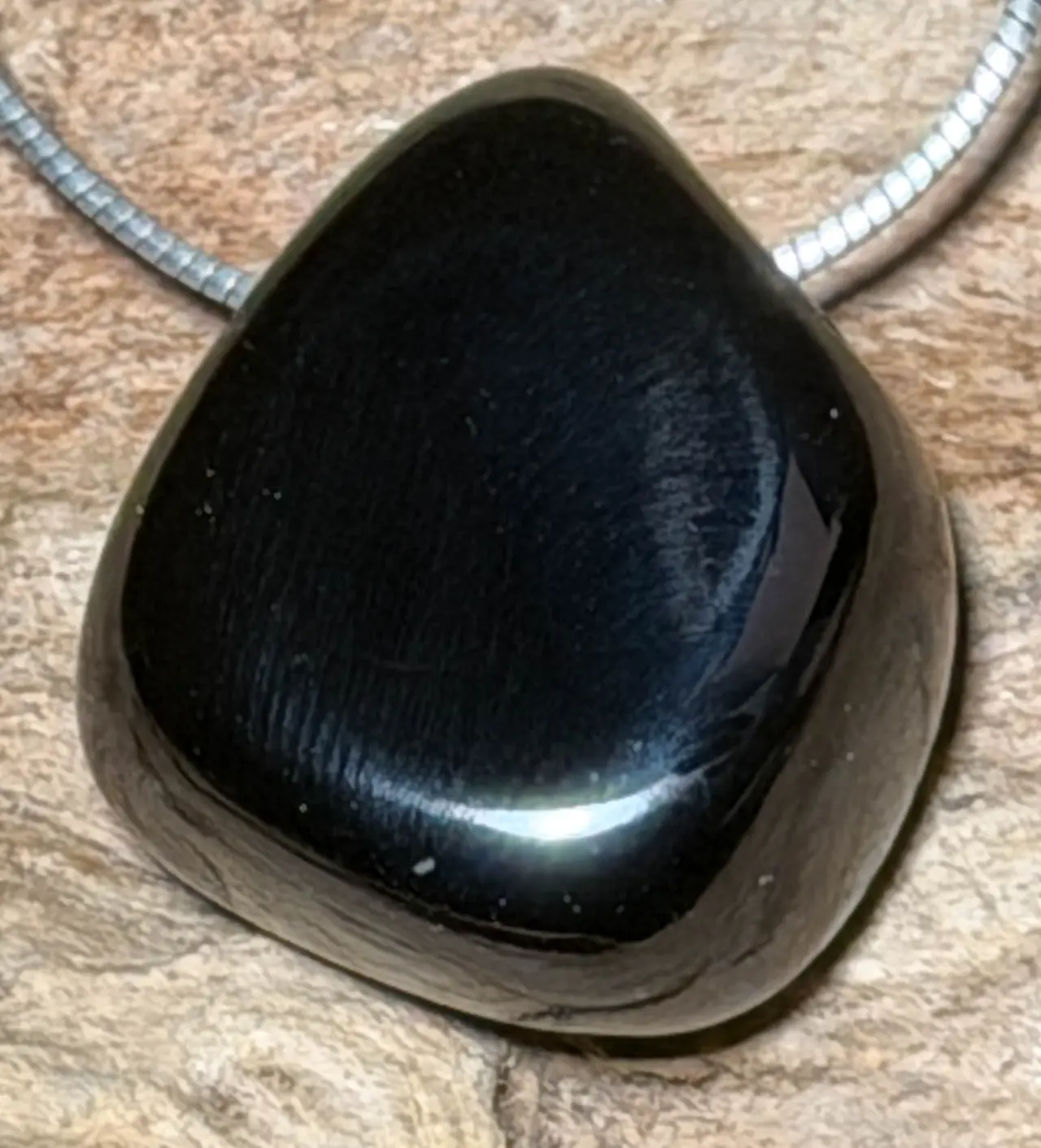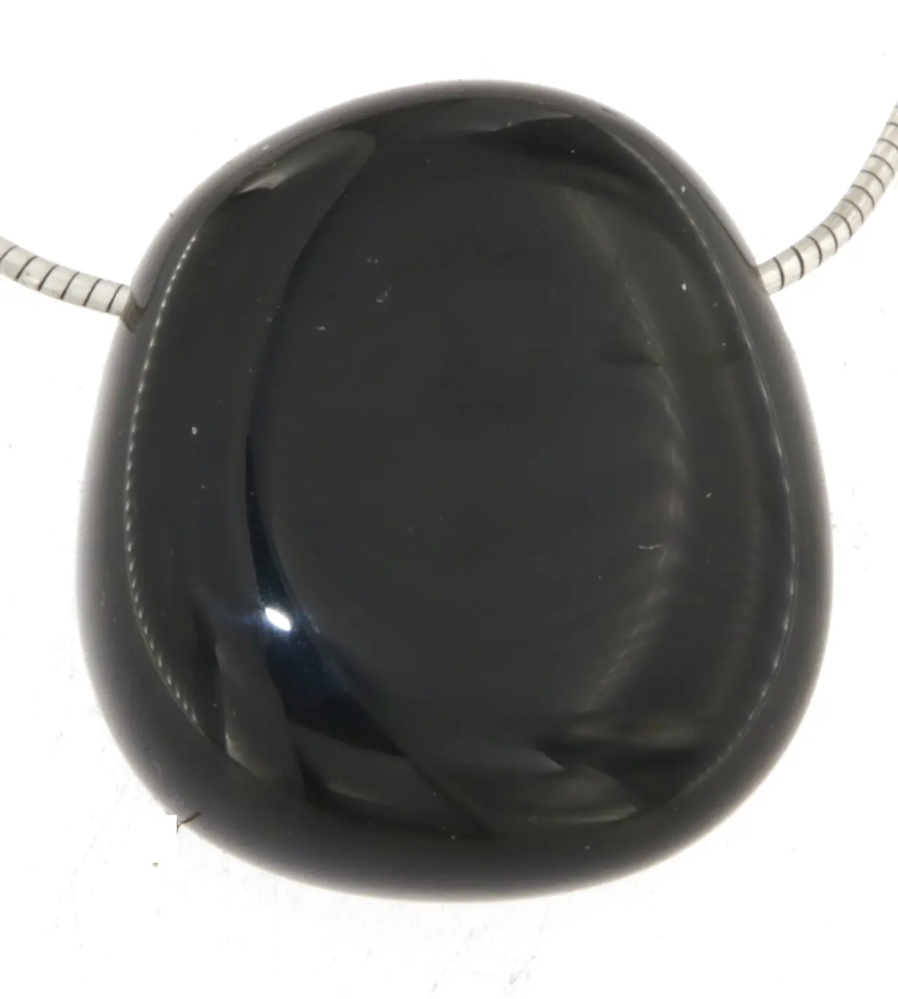 Ein kraftvoller Onyx-Anhänger, der für Schutz, innere Stärke und Stabilität steht. Der polierte Trommelstein zeigt das typische tiefschwarze, elegante Erscheinungsbild des Onyx – glatt, glänzend und mit natürlicher Präsenz.