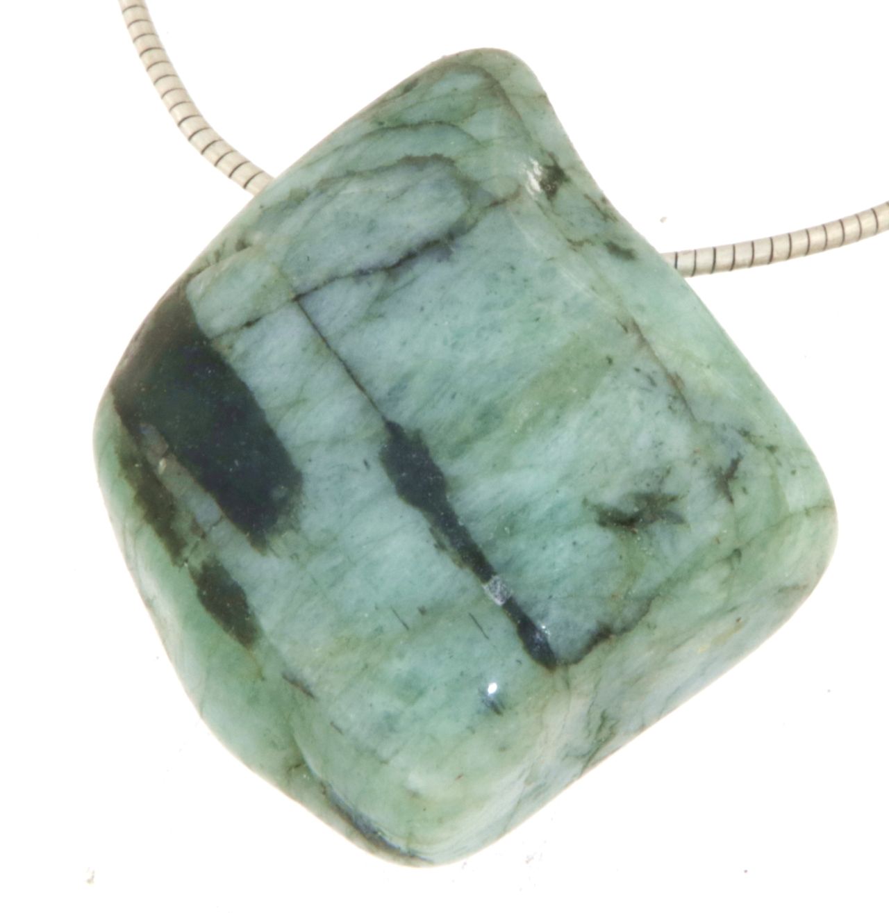 Edelstein Schmuck Trommelstein Anhänger aus Smaragd mit einem passenden Stoffband.