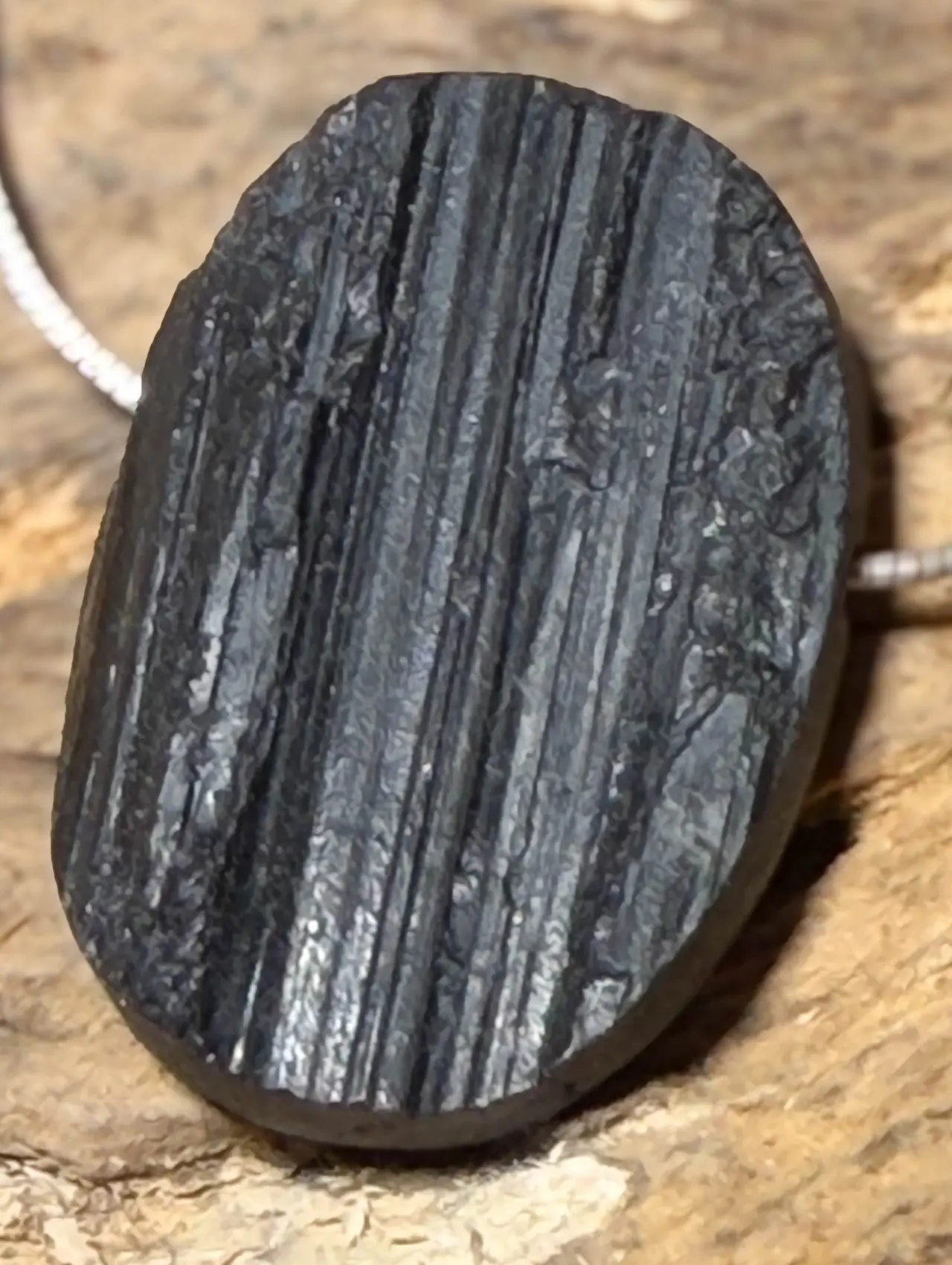 Edelstein-Trommelstein-Schmuckanhänger aus schwarzem Turmalin (Schörl) – mit Stoffband