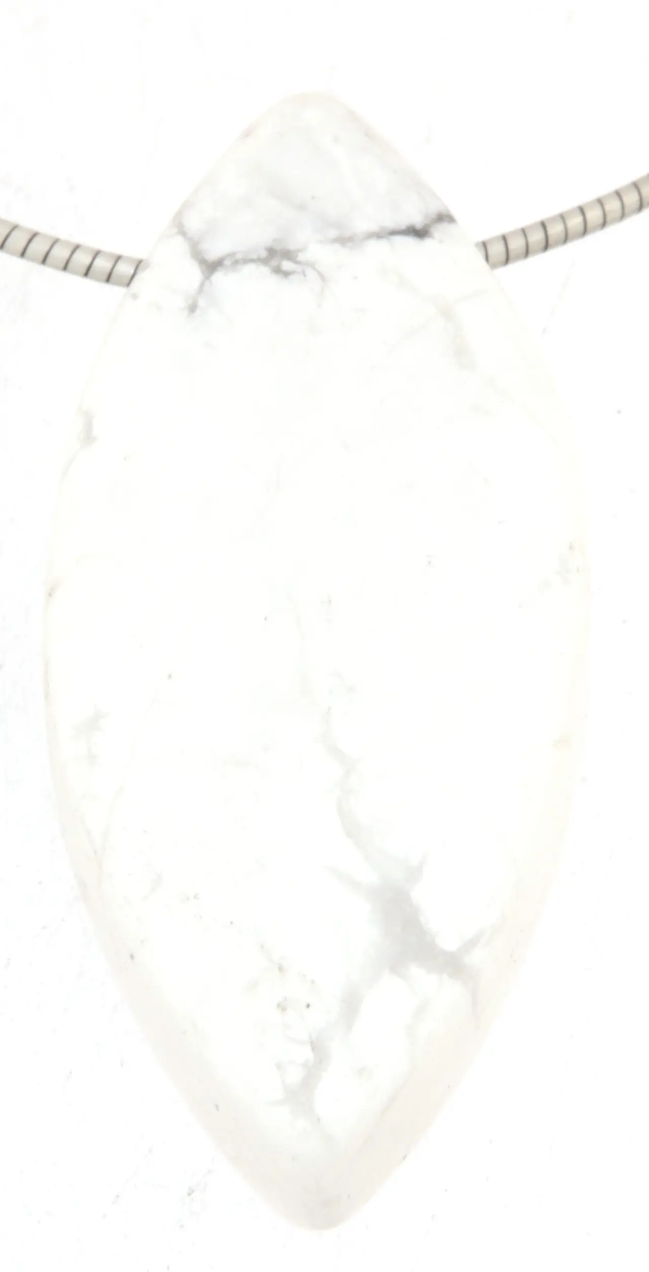 Ein stilvoller Edelsteinanhänger aus Magnesit, kunstvoll gearbeitet in eleganter Navetteform. Der Stein zeigt seine typisch weiße bis cremefarbene Oberfläche mit natürlicher grauer Aderung – ein ruhiges, harmonisches Farbspiel, das jeden Magnesit zu einem unverwechselbaren Naturunikat macht. Durch seine klare Form und schlichte Eleganz passt dieser Anhänger perfekt zu vielen Stilen, von modern bis naturverbunden.