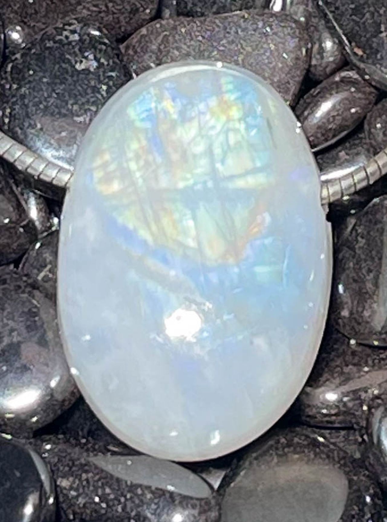 Du erhältst genau den abgebildeten Regenbogenmondstein Anhänger – ein besonderes Schmuckstück voller feiner Lichtspiele.