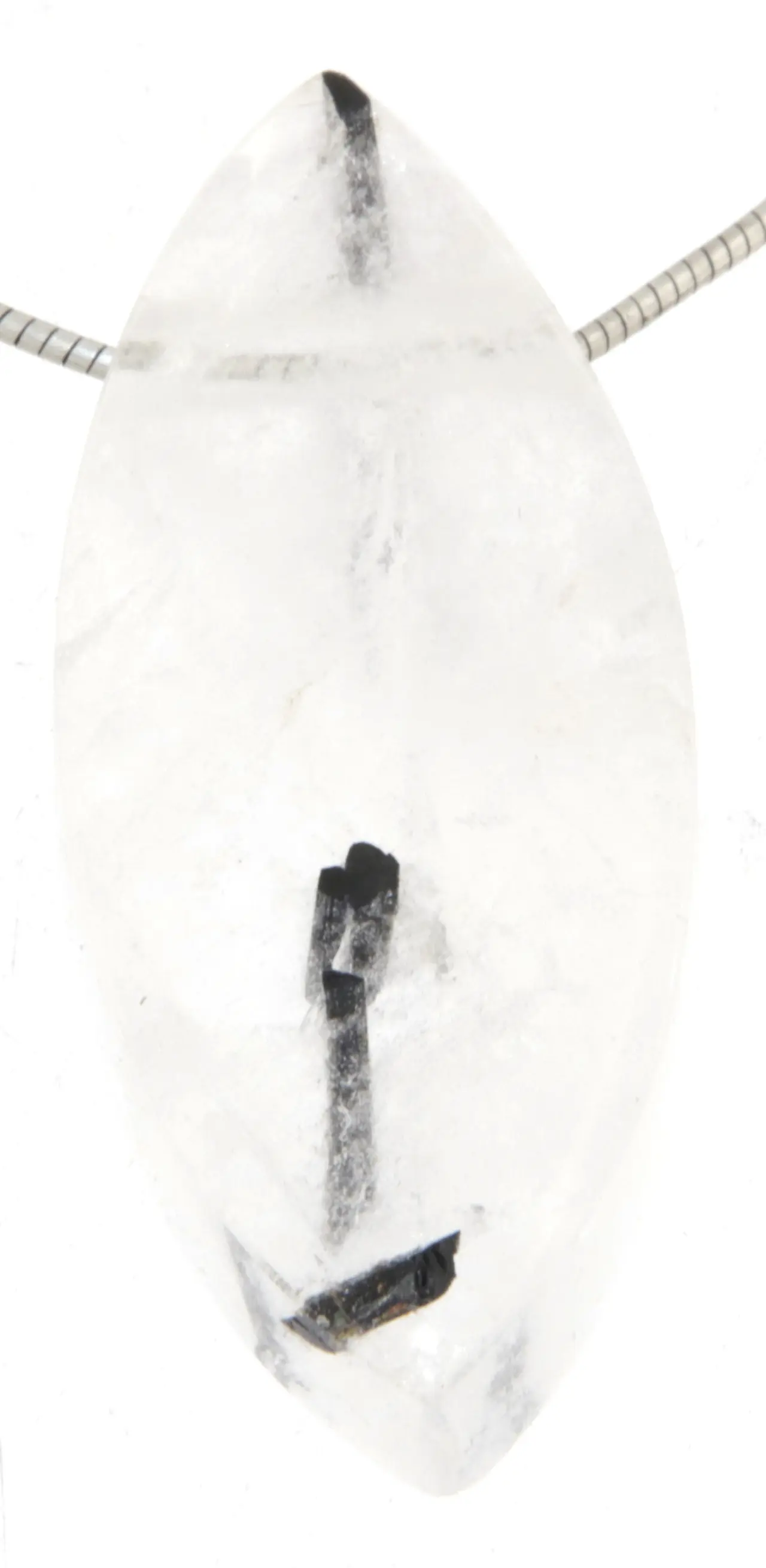 Ein edler Anhänger aus Turmalinquarz in eleganter Navetteform, der durch seine kontrastreiche, feine Struktur und seine klare, längliche Silhouette begeistert. Der polierte Edelstein vereint die Reinheit des Bergkristalls mit den charakteristischen schwarzen Turmalinadern – ein spannendes Zusammenspiel aus Transparenz und markanten, natürlichen Einschlüssen.