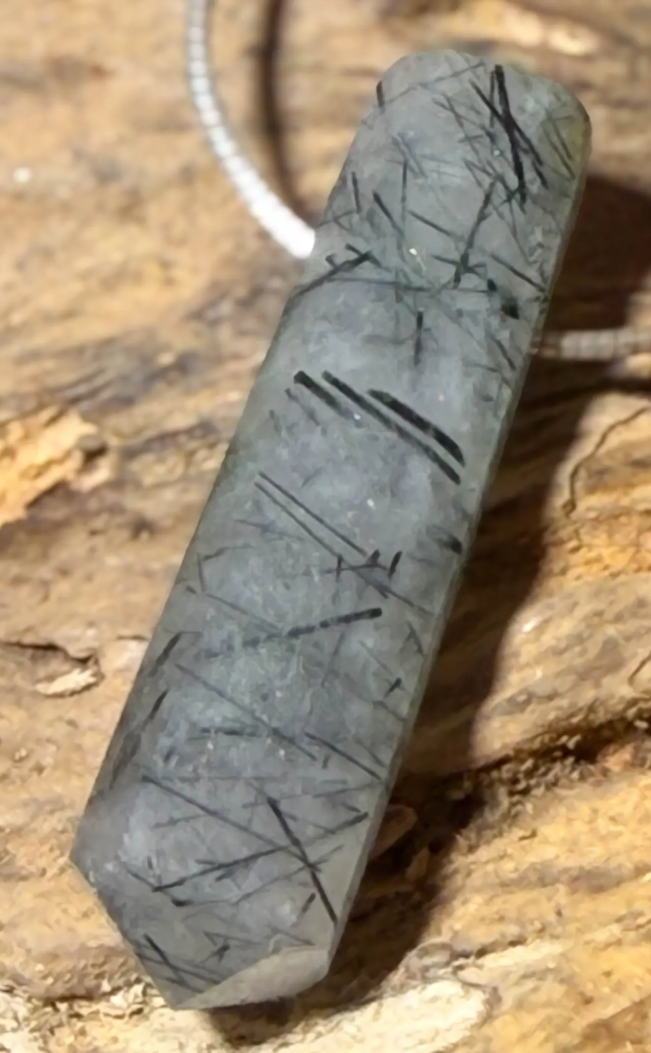 Ein faszinierender Anhänger aus Turmalinquarz, naturbelassen in seiner kristallinen Spitzenform. Die klare bis milchige Quarzmatrix durchzieht feine schwarze Turmalin-Nadeln, die dem Edelstein seine charakteristische, ausdrucksstarke Struktur verleihen.
