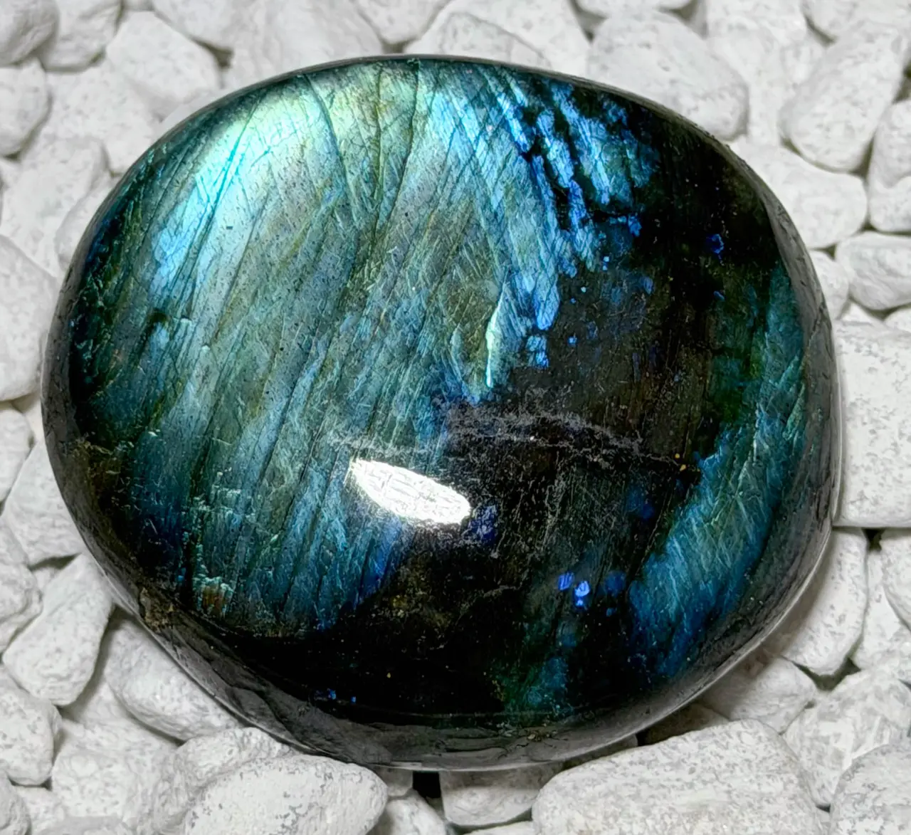 Dieser edle Labradorit Edelstein begeistert durch sein einzigartiges Farbspiel – das charakteristische Labradoreszieren, bei dem sich je nach Lichteinfall intensive Blau-, Grün-, Gold- oder Violetttöne zeigen. Jeder Stein ist ein faszinierendes Natur-Unikat, das durch seine irisierende Oberfläche und harmonische Form besondere Ausdruckskraft besitzt.
